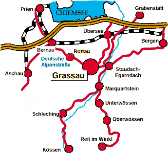 Bernau, von dort ca. 8 km auf der B 305 über Rottau nach Grassau.
